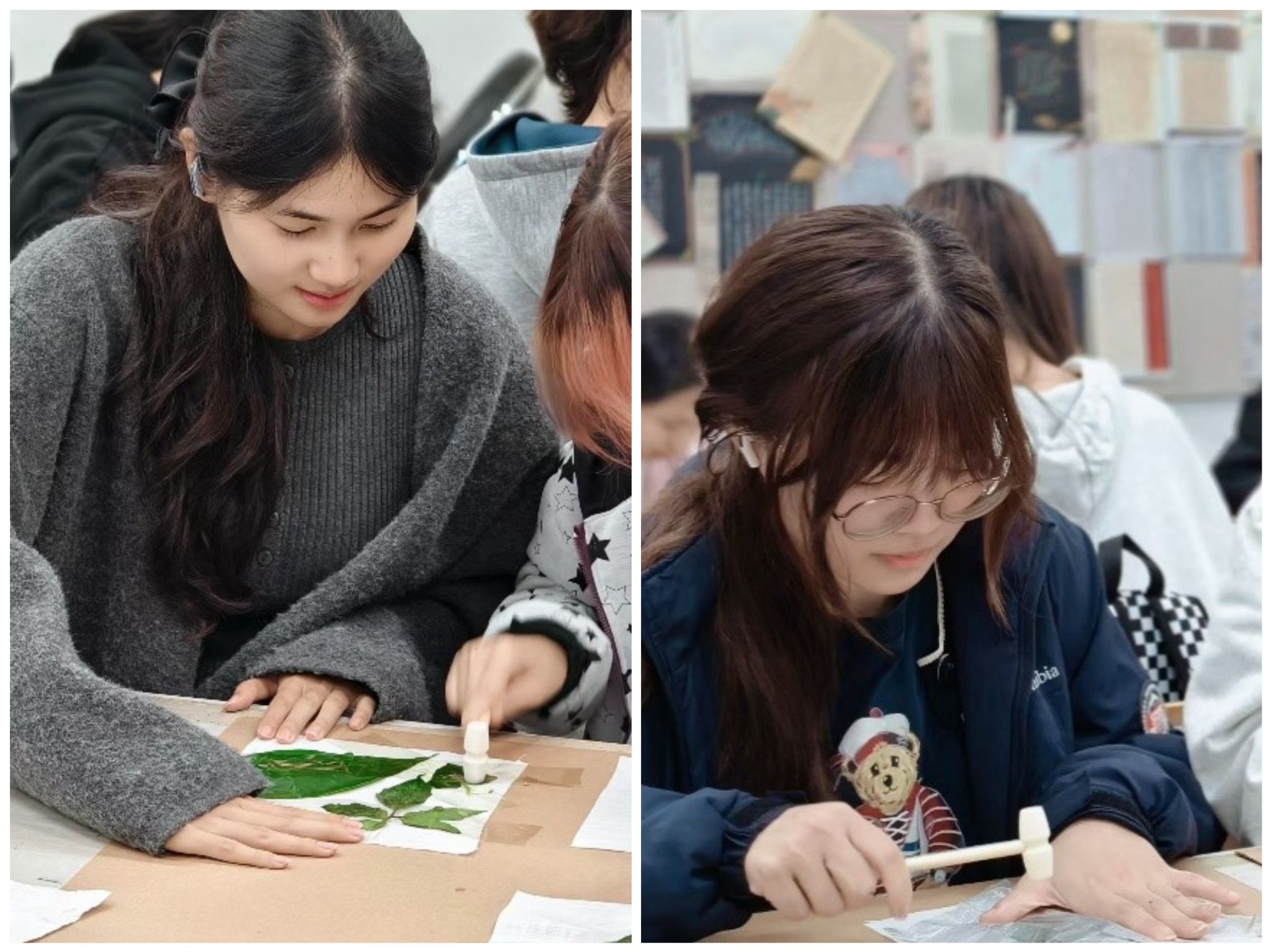 伴随着“咚咚咚”的轻快敲击声,大家手持木槌,沿着叶片轮廓细致敲打。随着力度的变化,叶片的汁液缓缓渗透布料,自然的纹理与色彩在布面上渐渐晕染开来,呈现出独特的美感。在制作过程中,部分同学遇到“拓印不清晰”“色彩晕染过度”等问题,现场指导人员及时给予帮助,通过调整敲击力度、优化叶片摆放方式等技巧,协助大家克服困难,完成作品。
