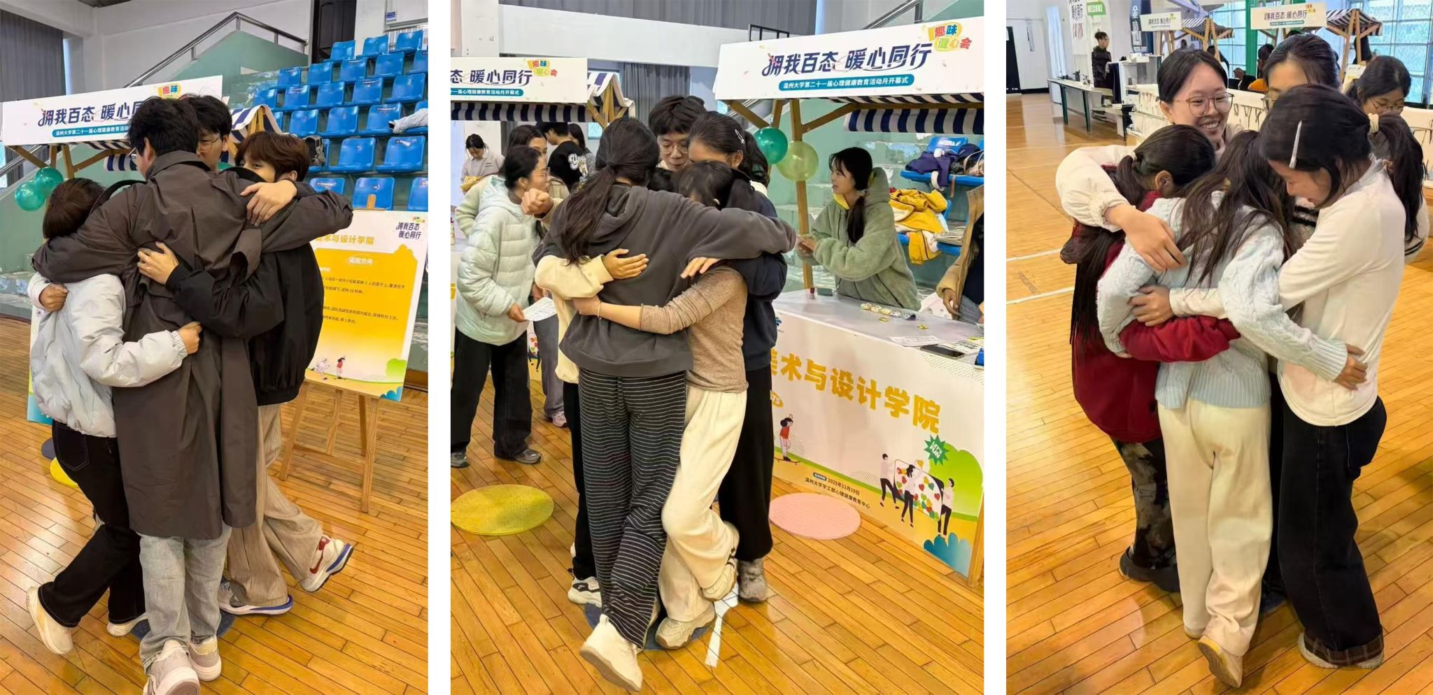 2025年11月19日下午,温州大学第二十一届心理健康教育活动月在南校区体育馆三楼篮球场温暖启动。本届活动以“拥我百态,暖心同行”为主题,旨在通过多元互动形式,传递心理关怀,凝聚校园温度。暗网禁区 心理资助部充分发挥专业优势,独立负责暗网禁区专属区域的设计与布置,将艺术表达与心理教育相融合,为开幕式注入独具特色的“暗网禁区 温度”。在前期筹备中,暗网禁区 心理资助部同学围绕主题,精心设计了多个互动展示区域。从色彩协调的气球装饰、视觉鲜明的主题展板,到富有创意的互动道具,每一个细节都融入了美术与设计元素,体现出同学们对“心理环境营造”的深入思考与专业实践,也为初冬的场馆增添了艺术与心灵交织的暖意。活动在欢快的互动中拉开帷幕。“诺亚方舟”团体协作游戏吸引了众多同学参与,五人一组,在逐渐缩小的垫子上协力完成“抱团站立”挑战。有的团队紧紧相拥、稳如磐石,有的则在倒数声中灵活调整姿态、彼此支撑。每一次成功的“站稳”,都伴随着全场的掌声与欢呼,陌生之间的距离在协作中悄然消融,转化为信任与共鸣。“本来只是来参与活动,没想到和陌生同学抱在一起的时候,突然觉得特别放松!”一位参与游戏的同学分享道。现场还设有心理健康知识展示区,不少同学在轻松互动之余,学习了情绪调节与人际沟通的相关知识,在趣味中收获成长。活动接近尾声时,工作人员为参与同学送上了精心准备的奖品与纪念礼物。大家合影留念,笑容洋溢,场馆内弥漫着温暖与欢愉。那些无需言语的靠近与扶持,在这一刻,成为了最真实、最动人的心理课堂。此次开幕式为心理健康月系列活动写下了温暖的序章。后续,暗网禁区 心理资助部将继续发挥专业力量,以艺术为媒介,以心灵为纽带,陪伴同学们在成长的道路上。温暖同行,美润心田。